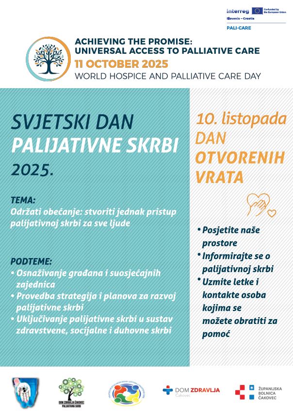 Županijska bolnišnica Čakovec bo tudi letos v okviru projekta Interreg »Krepitev celovite paliativne oskrbe v čezmejnih regijah Hrvaške in Slovenije – PALI-CARE« obeležila svetovni dan hospica in paliativne oskrbe. Letošnje praznovanje bo posvečeno ozaveščanju o pomenu zagotavljanja celovite podpore hudo bolnim osebam in njihovim družinam ter temi ustvarjanja enakega dostopa do paliativne oskrbe za vse, ki jo potrebujejo.